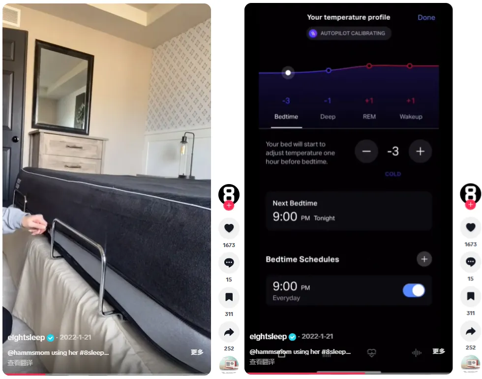 在视频里,用户充分展示了从安装 Eight Sleep 床垫到睡眠的全过程,以一种生活化的日常记录,悄然完成了产品核心功能与可靠感的直观传达。