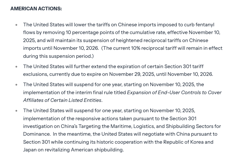 11 月 1 日,美国政府在白宫官网正式宣布针对中国贸易政策的调整变化,包括将芬太尼关税降低 10 个百分点、进一步延长某些 301 条款关税豁免的有效期、暂停收取港口服务费等。至此,美国对中国输美商品的总体关税税率约从 57%降至 47%。