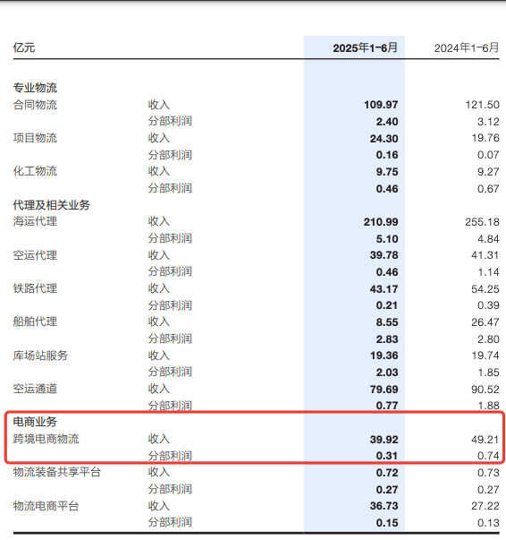 另据初海视野了解,上半年,另一家上市公司中国外运在跨境电商物流板块的利润也明显下滑。初海视野查询发现,其跨境电商物流的收入从去年同期的 49.21 亿元降至 39.92 亿元,减少了近 10 亿!分部利润则从去年同期的 0.74 亿元降至 0.31 亿元。