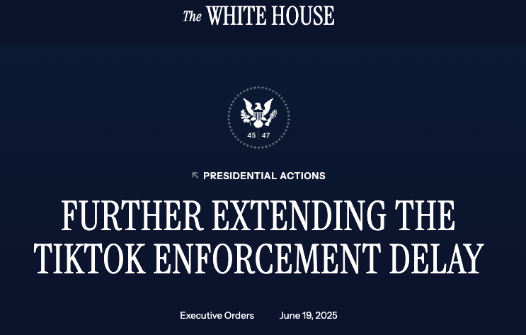 三次延期(2025年6月19日):特朗普在其社交平台发文确认,已签署行政命令,将《保护美国人免受外国对手控制应用程序法案》针对 TikTok 的限制期限延长至 2025年9 月17日(较原6月19日的截止日延后 90 天)。