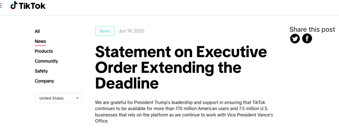 在特朗普签署行政命令后不久,TikTok 在官方网站发布了《关于延长截止日期的行政命令的声明》。