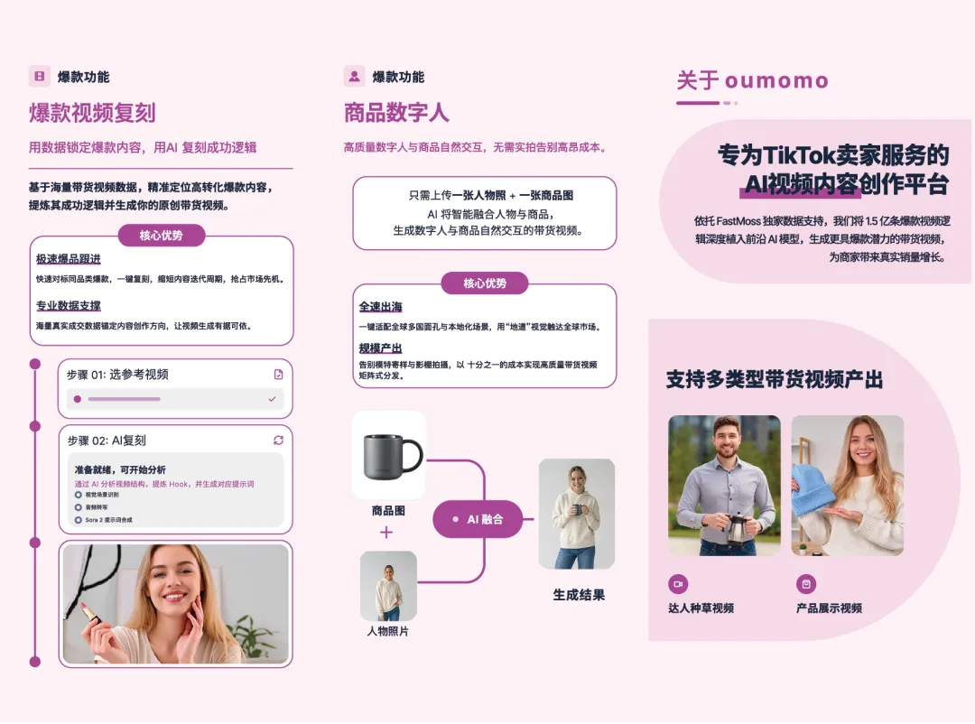 以业务确定性为导向的用户体验设计:在 OUMOMO 中,用户不需要反复调试参数或模型。系统通过稳定的输出质量与一致的生成逻辑,为用户提供可预期、可复用的结果体验,让卖家能够将注意力集中在选品、投放与增长本身,而不是消耗在内容生成的不确定性上。