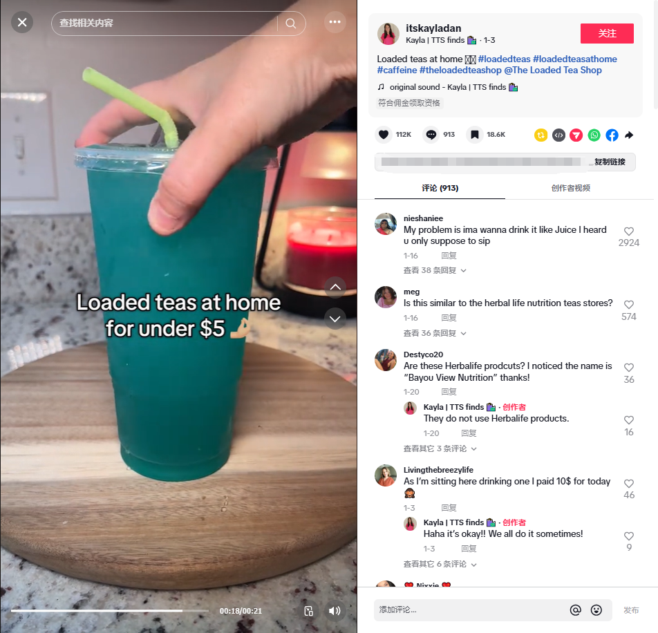 其中最火爆的一条来自达人 @Kayla | TTS finds,她演示了“如何用低于 5 美元自制一杯健康茶饮”,直击消费者省钱又健康的痛点,播放量突破 1130 万次。