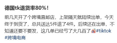 前段时间,一位德区TikTok Shop卖家在社交媒体上表示,自己才刚开店不久就栽了跟头,称“退货率高达80%”。