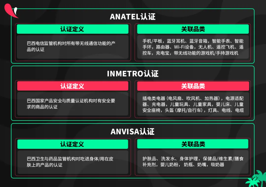 如果您计划销售以下产品,需要在产品上架前确保产品具备相关本土认证证书,如ANATEL/INMETRO/ANVISA等: