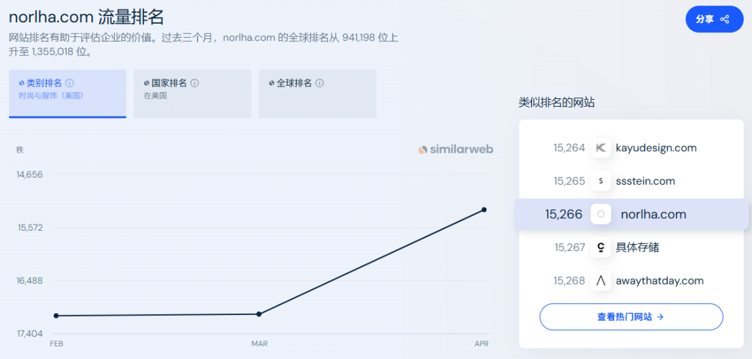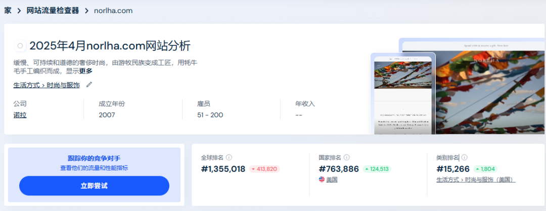 在特定类别中,norlha.com 也表现出较强的竞争力,在时尚与服饰类别中的排名为第 15266 位。用户在该网站的平均每次访问页数为 2.68 页,平均访问时长为 1 分 9 秒,这显示出用户对网站内容的浏览深度和停留时间都较长,表明网站内容对用户具有一定的吸引力。