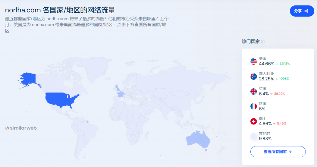 在美国,norlha.com 的排名为第 763886 位,显示出其在美国市场的良好表现,而美国也是其主要流量来源国家之一,占比达 44.66%,此外,澳大利亚也是其重要的流量来源国,占比 28.25%,这表明其在这两个国家的品牌影响力和市场渗透力较强。