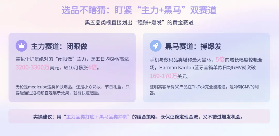 实操建议是:用“主力品类打底+黑马品类冲刺”,比如深耕美妆个护的同时,搭配一款适配短视频展示的数码配件,既保证稳定现金流,又能抓住爆发机会。