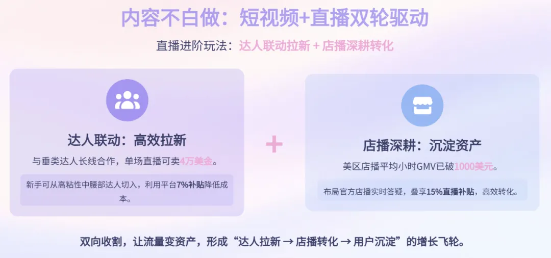 而POPMART等品牌则靠店播站稳脚跟,如今美区店播平均小时GMV已突破1000美元,成为沉淀用户资产的核心阵地。
