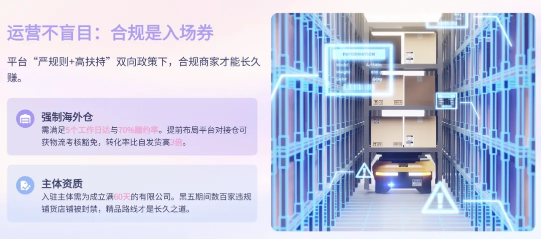平台已明确要求,入驻主体需为成立满60天的有限公司,且强制海外仓发货(需满足5个工作日达+70%履约率)。黑五期间,数百家违规铺货店铺被封禁,再次证明“精品路线+合规经营”才是长久之道。