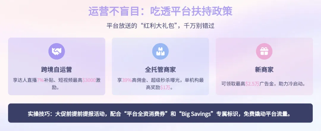 平台为商家准备的“红利大礼包”,千万别错过:跨境自运营商家可享达人直播7%补贴、短视频最高3000美金激励;全托管商家有39%高佣金、超级秒杀曝光加持,单机构最高可获1万美元奖励;新商家还能领取最高2.5万美元广告金。