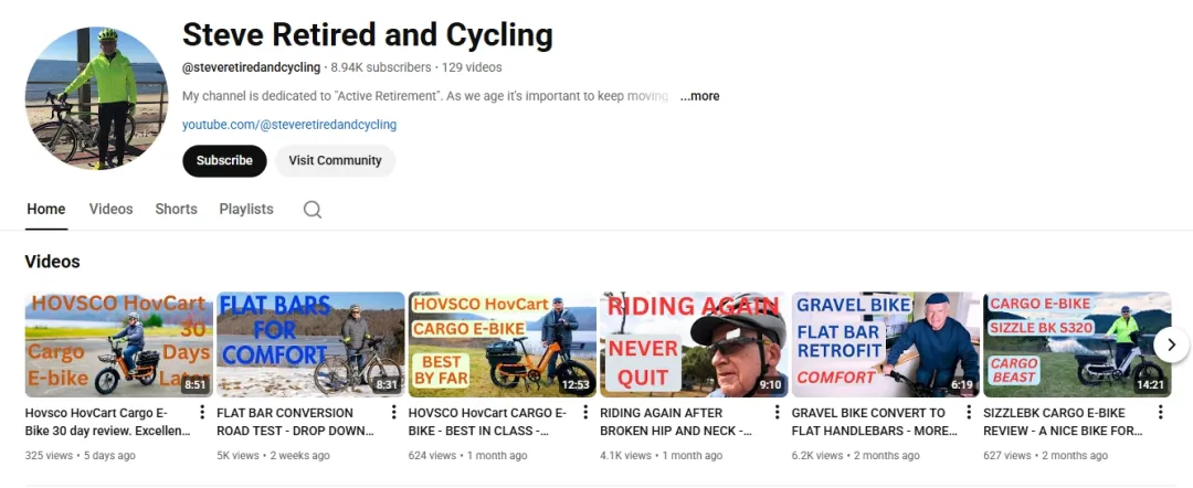 例如 YouTube 骑行博主@Steve Retired and Cycling(专注退休后骑行生活分享)等垂直创作者,内容贴近LIVALL的核心用户群体,无论是分享智能头盔的安全用法,还是自行车助力器的骑行体验,都比硬广更有说服力,能有效推动品牌出海的口碑沉淀。
