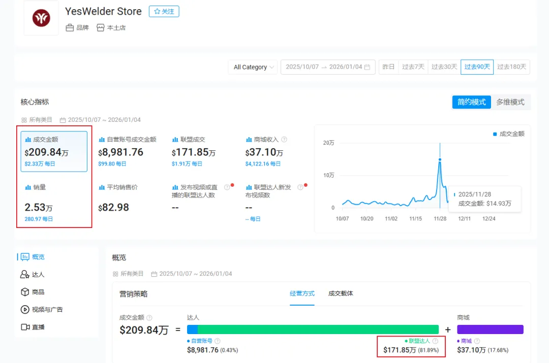 从销量来源结构来看,品牌自营账号贡献占比仅为 0.43%、商城渠道占比 17.68%,而联盟达人渠道以 81.89% 的绝对占比成为核心销量支柱,对应的成交金额达到了 171.85 万美元。