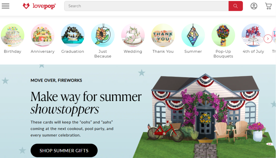 相较传统贺卡预制祝福语这种“老土”的贺卡模式,据直击跨境了解到 LovePop 独立站则以立体贺卡这一卖点切入,同时还根据美国人的特色化场景需求拓展了定制化贺卡业务,率先在北美抢占了用户心智、且提前在北美贺卡市场树立了竞争壁垒。