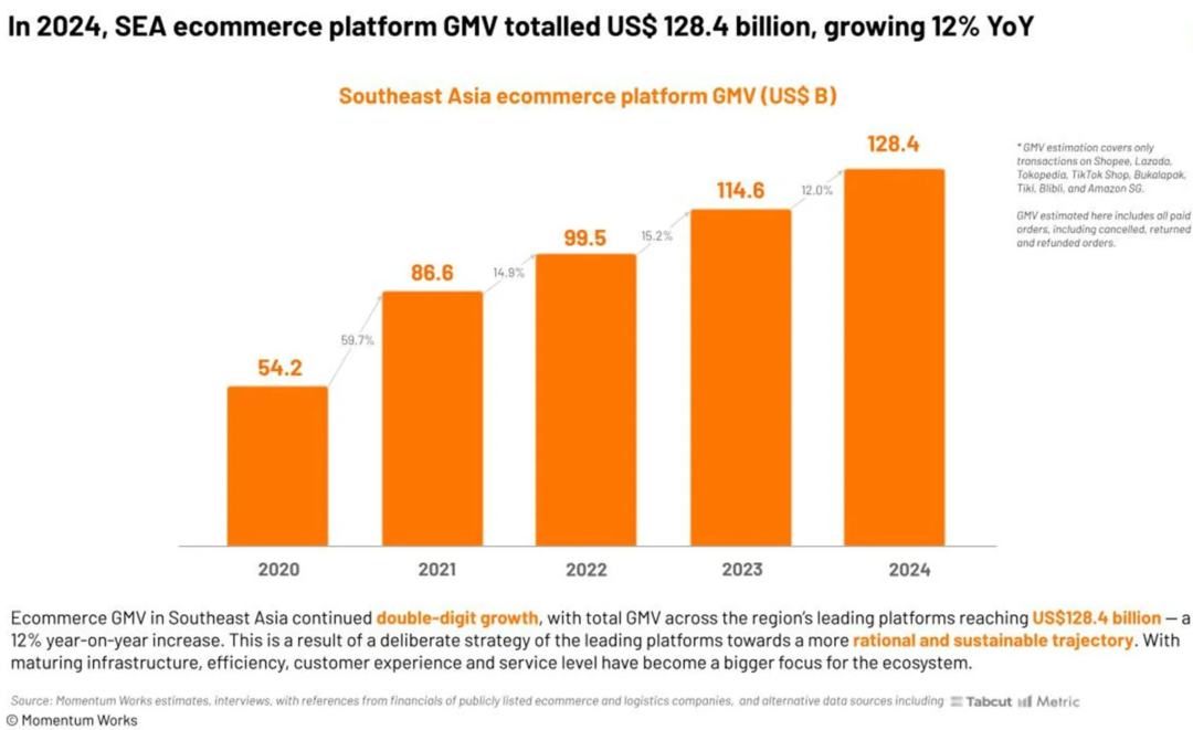 从东南亚电商市场整体情况来看,Momentum Works 的数据显示,去年该地区电商交易总额(GMV)达到 1284 亿美元,同比增长 12%。
