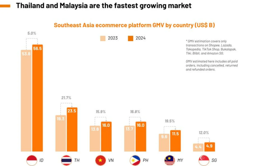 不过,与 2022 年相比,印尼的市场份额从 52% 有所下降,且其电商交易总额增幅仅为个位数。而泰国和马来西亚则是去年 GMV 增幅最快的国家。