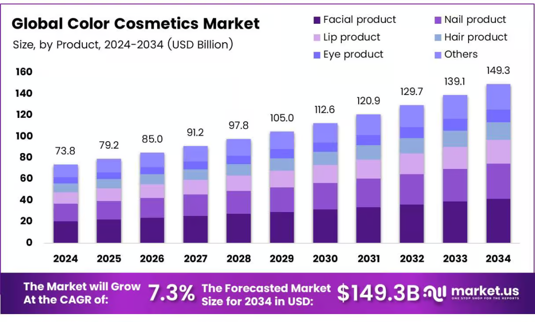 据市场研究机构 market.us 数据显示,全球彩妆市场的规模预计将从 2024年的 738 亿美元增长到 2034 年的约 1493 亿美元,在 2025 年至 2034 年间,该市场的年均复合增长率将保持在 7.3%,发展势头强劲。
