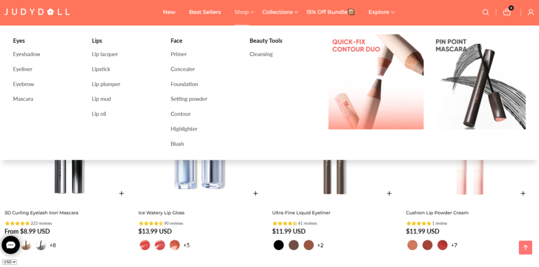 在独立站首页,Judydoll 品牌对所有产品进行了清晰的分类,分为眼部、唇部、面部及美容工具四个板块,还设置了畅销产品专区和新品到货专区,方便购买者快速找到目标产品。