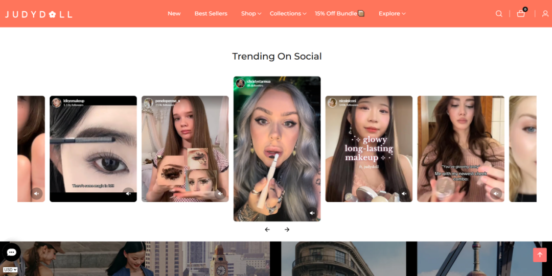 此外,Judydoll 的独立站还建设了社交媒体流行板块,展示用户自发生成的 UGC 内容。这些真人试色内容对提升潜在用户好感和促进销售转化都有很大的帮助。