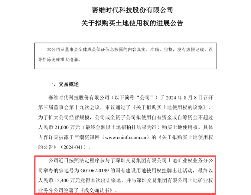 据赛维公告称,其按照法定程序参与了深圳交易集团有限公司土地矿业权业务分公司举办的宗地号为 G01062-0199 的国有建设用地使用权挂牌出让活动,最终以人民币 1.54 亿元竞得本次出让宗地。