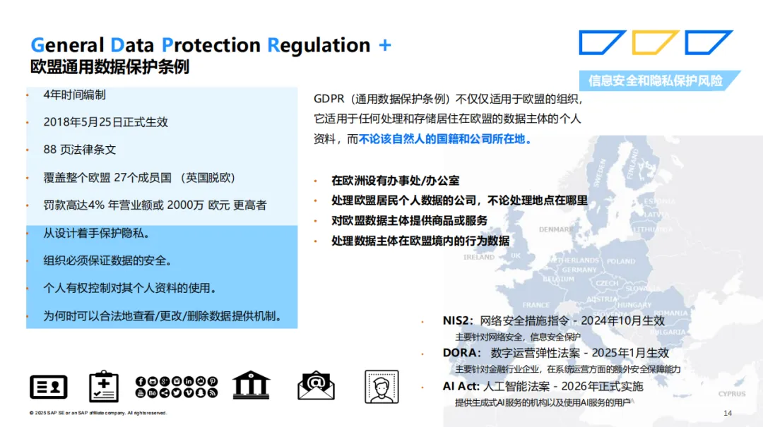 针对GDPR合规,他强调数据本地化、脱敏、权限管控三位一体。SAP提供全球数据中心部署,支持数据本地化存储;总部需访问数据时,系统可自动脱敏敏感信息;权限严格匹配岗位职责。