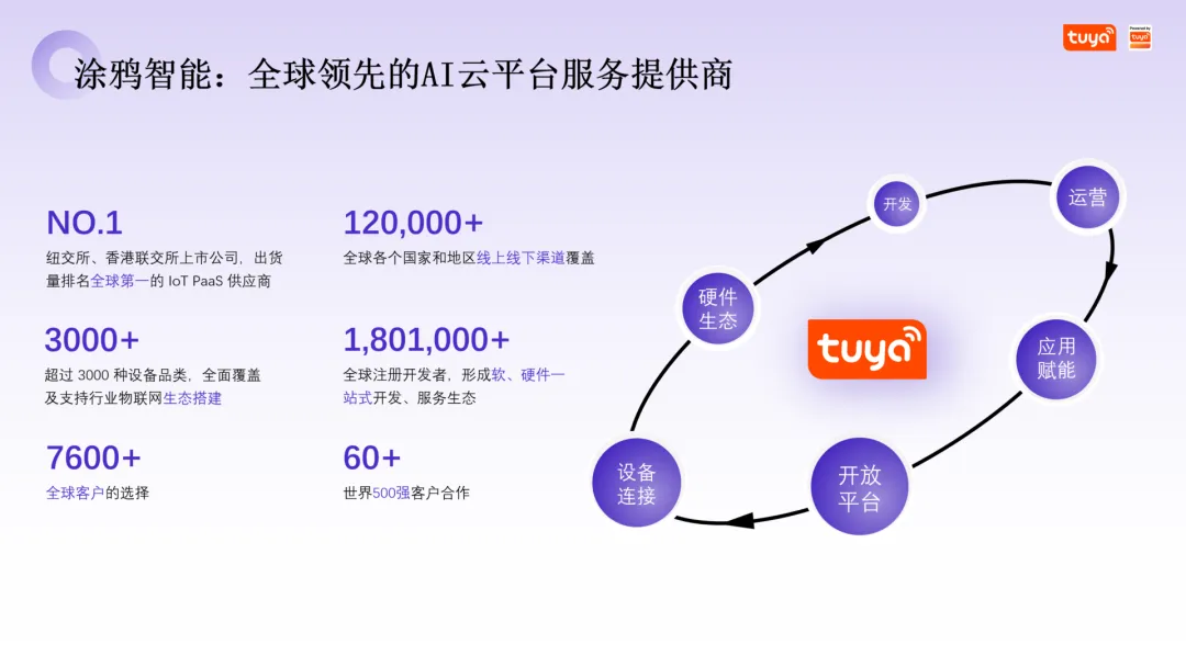 同时,张华也分享涂鸦了的定位和使命:涂鸦智能(纽交所代码:TUYA;港交所代码:2391)是全球领先的 AI 云平台服务提供商,致力于将 AI 应用于生活,通过 AI Agent 开发平台、TuyaOpen 开源开发框架等通用 AI Agent 引擎,集成多模态 AI 能力,降低 AI 开发门槛,高效推进 AI 生活实现,加速 AI 与物理世界的深度融合。