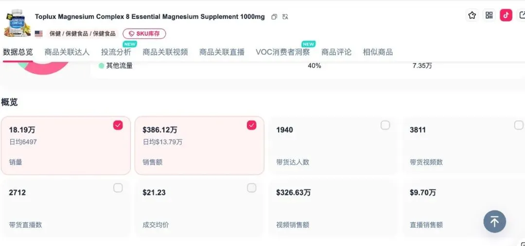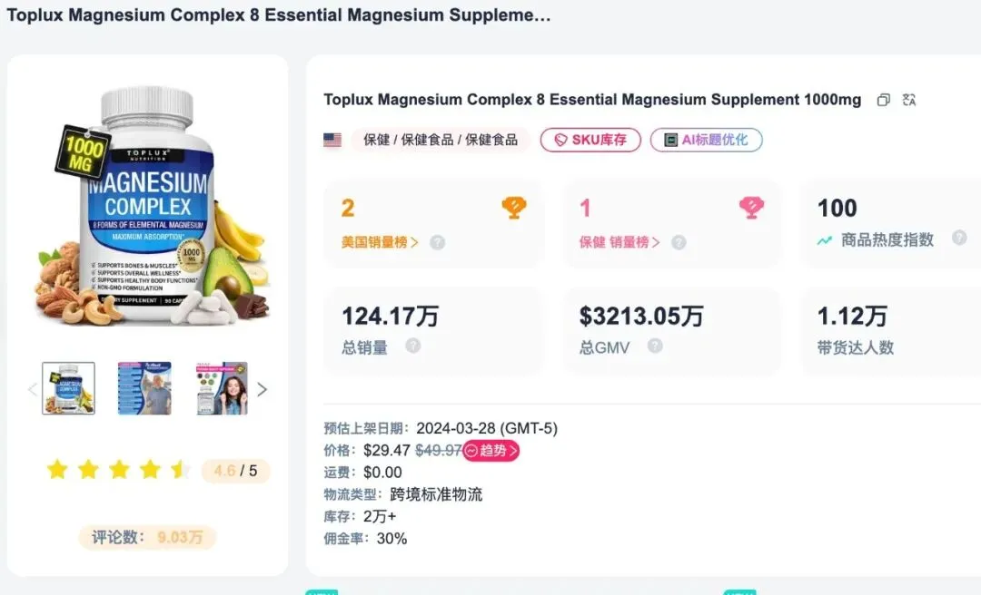 TikTok Shop 美国保健 Top1!这款镁补剂两年销量 124 万 +,GMV 超 3200 万美元
