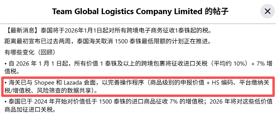自2026年1月1日起,泰国小额进口免税政策彻底终结。所有低价值进口(低于 1500 泰铢)商品将被征收10%的关税,并同步课征增值税与消费税,以此抑制低价劣质商品涌入泰国市场。