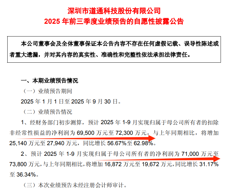 近日,道通科技发布 2025 年前三季度业绩预告,预计前三季度归母净利润为 7.10 亿元至 7.38 亿元,与上年同期相比将增加 1.69 亿元至 1.97 亿元,同比增长 31.17% 至 36.34%;