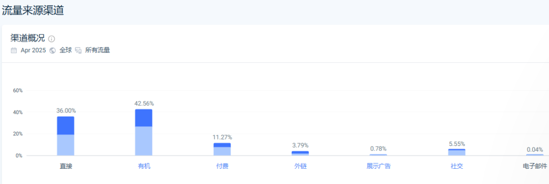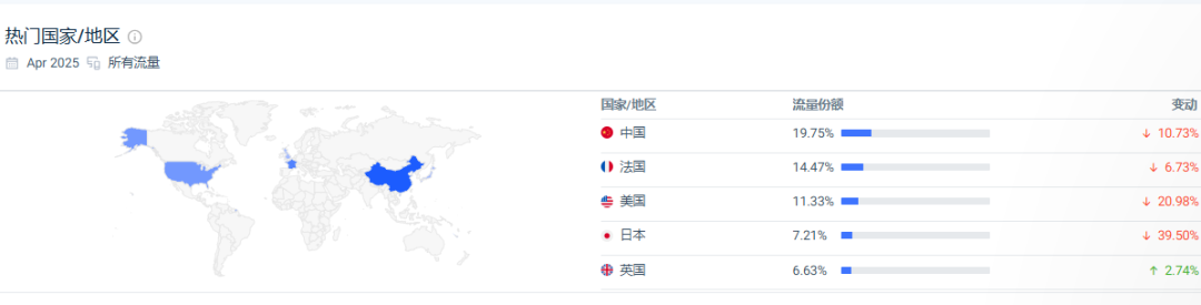 尽管相较于上个月有所下降,极米的独立站仍表现良好,2025年4月全球总访问量为42万+,访问者以中青年为主,热门地区集中分布在中国、法国、美国、日本、英国等国家。流量来源渠道包括有机流量42.56%,直接流量36.00%,社交流量5.55%,付费流量11.27%,可见品牌知名度较高,用户忠诚度较高。