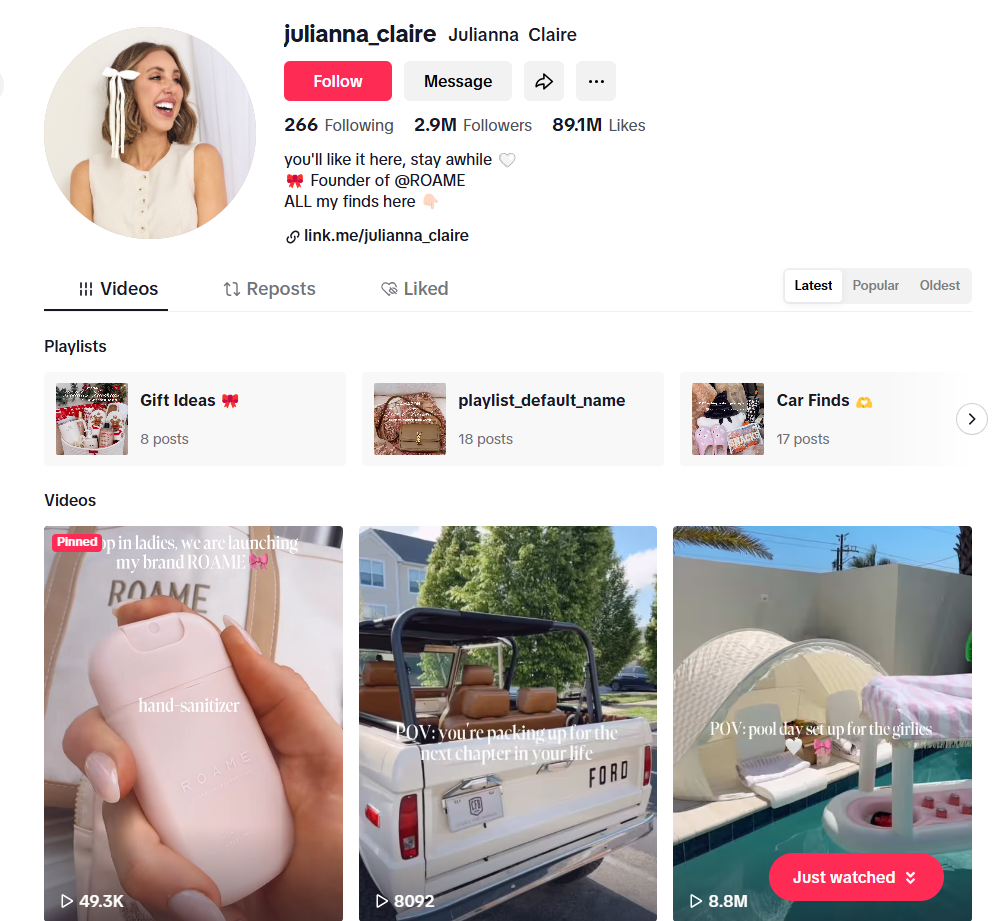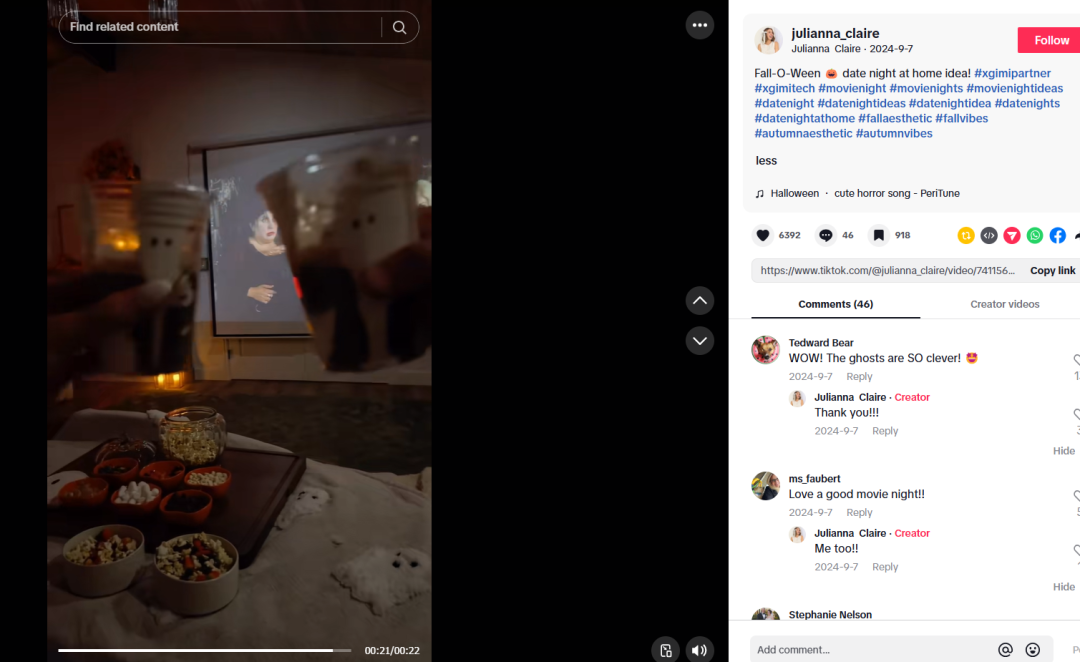 TikTok博主@julianna_claire的视频中呈现了一个温馨的电影观看环境,让极米投影仪在观众心里留下了美好的印象,有助于将观看者发展为潜在的购买者。