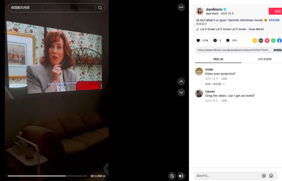 圣诞节的夜晚,窝在柔软的沙发里,打开一部电影,获得清晰的电影观看体验。博主@daniklaric的视频无疑给用户一个关于生活的温馨畅想,她的这个安利极米投影仪的视频获得了2.7万+点赞,1711次收藏。