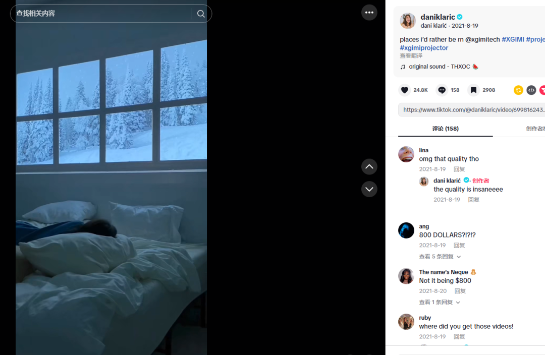 她的另一个视频实用极米的投影仪播放电闪雷鸣的雨天、霞光满布的海洋、银装素裹的凛冬乃至漫画场景的视频,解锁了投影仪的另一种用法,很富有创意,评论区不少留言都表达了对该产品的强烈喜爱。