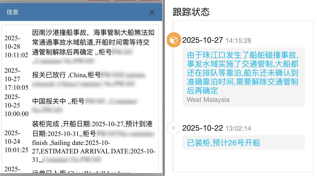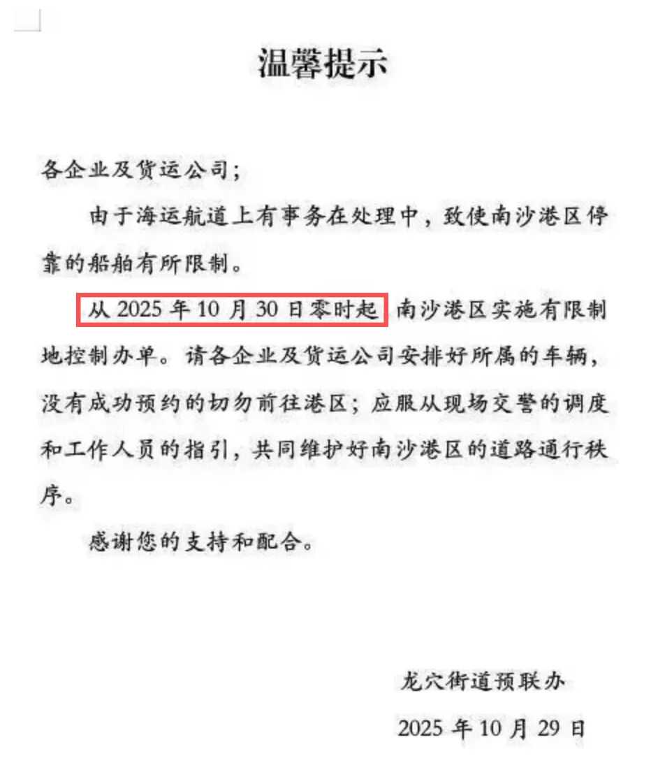 虽说10月27日立即开通了临时航道,南沙港船舶恢复正常通行,但临时航道毕竟运力有限。随着事件影响沿着海运链路传导至上下游环节,涉及海运时效、舱位协调、订单交付等环节的一系列连锁挑战正迎面而来。