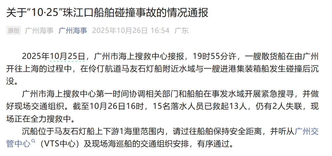 事故发生后,广州海事局紧急发布“粤航警375/25”,划定沉船危险区域进行水上交通管制,并实施南沙、黄埔、虎门等主港的临时封航。
