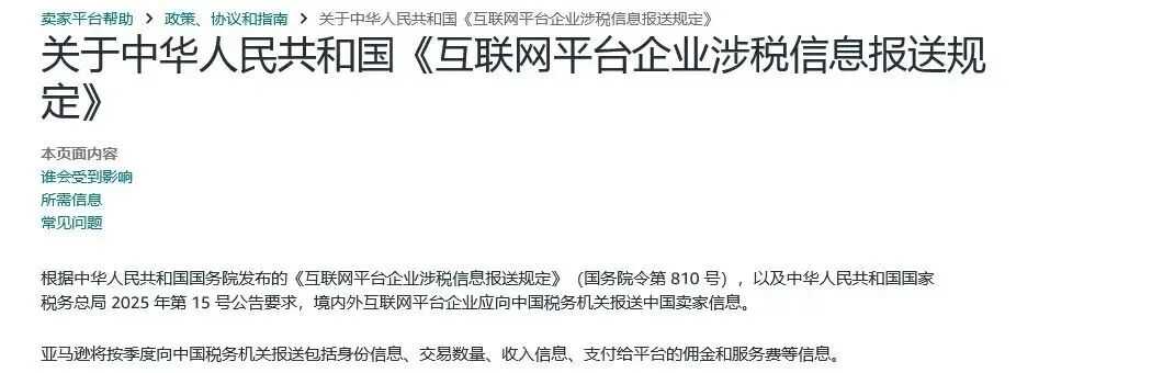 根据中华人民共和国国务院发布的《互联网平台企业涉税信息报送规定》(国务院令第810号),以及中华人民共和国国家税务总局 2025 年第 15 号公告要求,境内外互联网平台企业应向中国税务机关报送中国卖家信息。