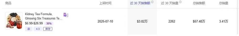 这款人参五宝茶来自一家跨境店铺 Unique sell,自 7 月 10 日正式上架以来,市场表现格外亮眼。截至目前,其总销量已达 3.41 万,总销售额更突破 57.48 万美元(约合 408 万人民币)。该产品在 TikTok shop 美区售价6.99美元(约 50 元人民币)/20 小包,每小包 2.5 元,同款产品在 1688 售价每小包 0.31 元。
