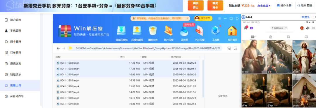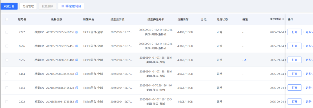 从后台管理界面能看到,多个 TikTok 账号绑定不同地域 IP(美国洛杉矶、费城、纽约,亚太日本东京、越南河内等),内存占用稳定,分身状态全部正常。用户可直接在控制台批量添加分身、分组管理,一键打开账号操作,甚至能批量上传多个 MP4 视频,51MB 的文件秒处理,省去反复切换设备的麻烦,运营效率直接提升 10 倍。