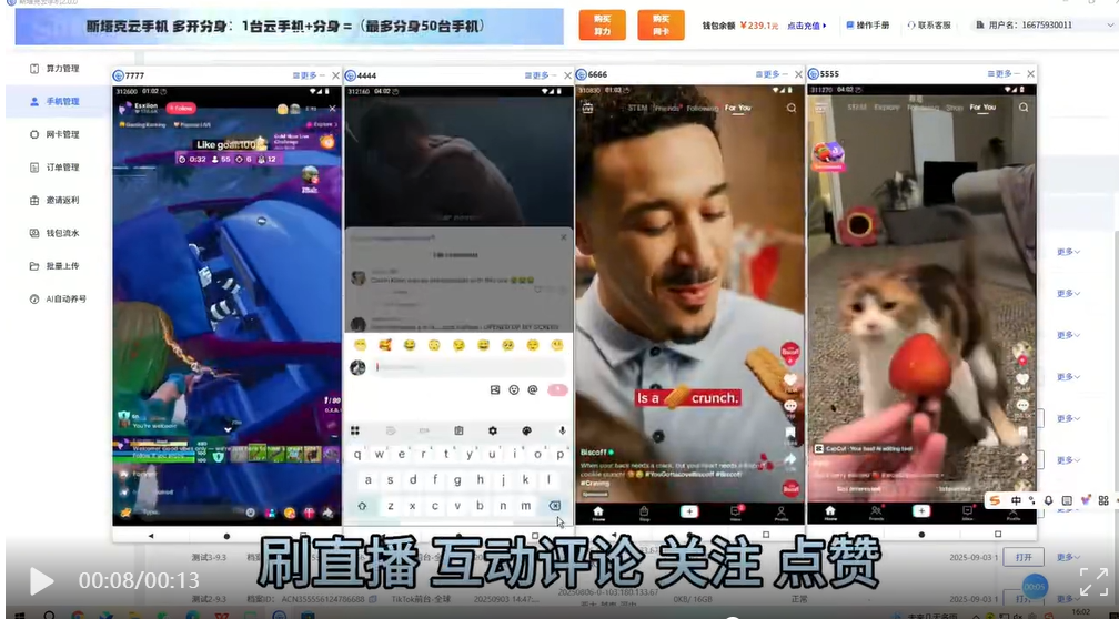 不用再手动给每个手机上号、传视频、做互动!它支持 1 台云手机最多分身 50 台设备,百个账号同步管理,刷视频、看直播丝滑不卡顿,还能设置自定义发布时间,AI 自动模拟真人浏览、点赞、评论,实现 24 小时无人值守养号。哪怕你凌晨睡觉,账号也在自动抢流量、跟热点,比同行快一步抢占市场。四大带货场景全覆盖,变现路径全打通
