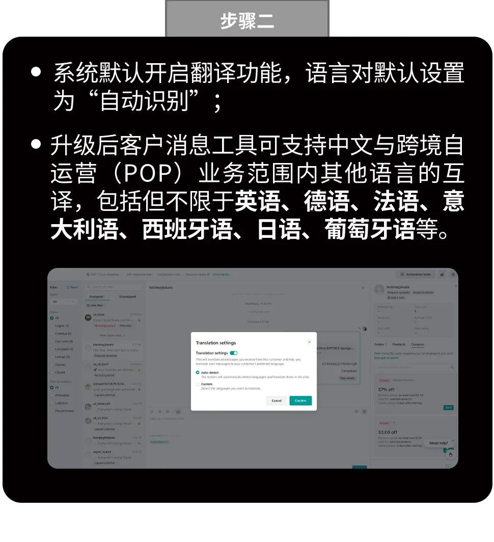 • 多语言实时互译:旧版客户消息工具仅支持客服输入英文,升级后可输入中文和其他语言,均支持相互翻译,帮助商家更顺畅地与全球买家沟通。