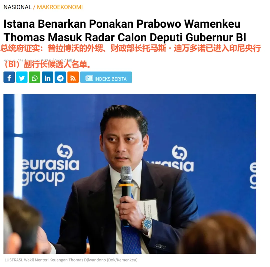 👉 2026年1月,印尼总统普拉沃博提名自己的外甥托马斯·吉万多诺担任中央银行副行长,市场质疑央行是否能保持独立性,次日,印尼盾兑美元一度跌至16,945。