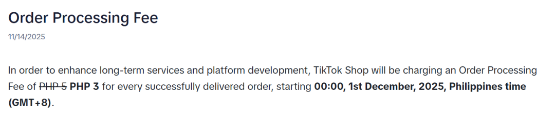 最先让卖家们感到窒息的,是菲律宾市场接二连三的费用新增。TikTok Shop菲律宾站将从 12 月 1 日起效仿 Shopee 和 Lazada,收取额外的 5 比索“订单处理费”。