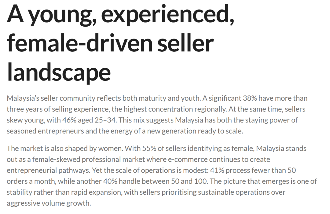 从卖家结构来看,马来西亚电商市场呈现 “成熟与年轻并存” 的特点:38% 的卖家拥有三年以上销售经验,46% 的卖家年龄在 25-34 岁之间,且女性卖家占比达 55%,成为女性创业的重要渠道,但有限的订单规模让多数卖家难以实现规模化发展。