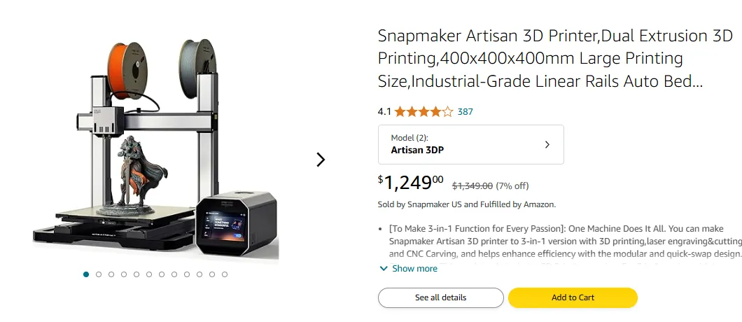 以快造科技旗下品牌 Snapmaker 的一款 3D 打印机为例,该产品在亚马逊的售价高达 1249 美元,目前已累计获评 387 条,综合 4.1 分,表现可圈可点。