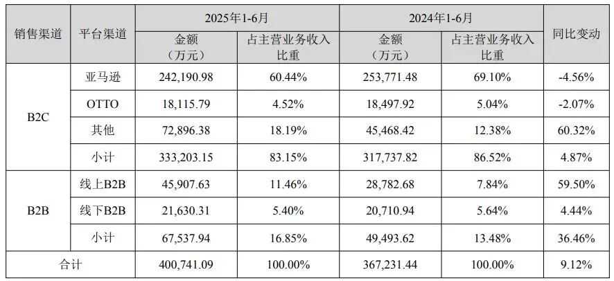从效果来看,这些新兴平台加上其他 B2C 第三方平台,上半年一共带来了 7.29 亿元收入,同比增长 60.32%,占总营收的比例也提升到了 18.19%;相应地,亚马逊的收入占比降到了 60.44%,对传统平台的依赖度明显降低。