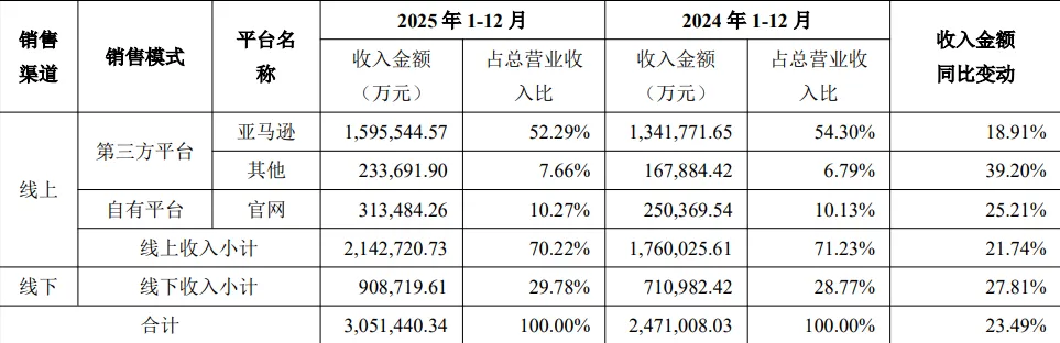 这在财报中表现尤甚:2025 年安克亚马逊实现营收 159.55 亿元,占总营收比例为 52.29%;充电储能品类实现营收 154.02 亿元,占总营收比例为 50.47%。
