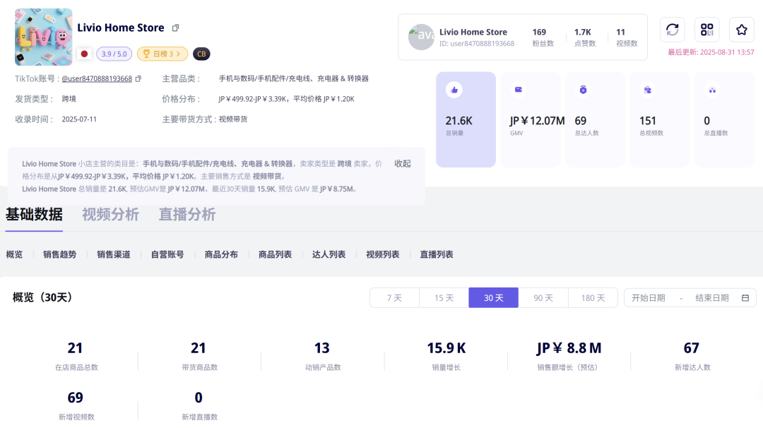 同样是手机与数码类小店,PAXA JP 走的是 “后来居上” 路线。27 款商品,均价约 1910 日元,近 30 天销量 8.4K、GMV1548 万日元,总销量 9.4K、总 GMV1718 万日元。它借助 814 位达人、1400 条视频推广,达人数量多、视频基数大,靠着持续的内容输出和达人矩阵,慢慢积累流量,销量曲线呈现出稳步上升的趋势,堪称 “厚积薄发” 的典范。
