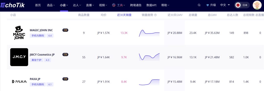 除了以上两家,销量排名3.4.5名,还有这三家TikTok 日本直邮小店,MAGIC JOHN INC、JMCY Cosmetics JP、PAXA JP 三家可谓 “神仙打架”,各凭本事在不同赛道爆单,咱们来瞧瞧它们的 “制胜法宝”~