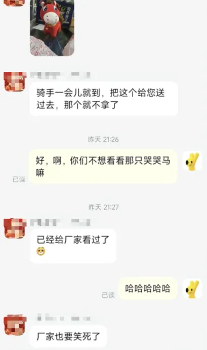 原本按照常规逻辑,这样的产品只会被视为残次品。然而,一位消费者在收到玩偶后意外发现“表情不对”要求换货,并将这只“嘴巴缝反的马”上传至社交平台,随即引来大量调侃和共鸣。