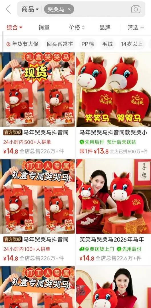“通常 12 月至次年 1 月是生肖系列产品的销售黄金期,但这次的马年系列产品起初并未形成热销之势,比如这款“笑笑马”产品就销量平平。”张火清说道。但塞翁失马,焉知非福,如今这款“哭哭马”被张火清摆在了店铺 C 位,订单已经排到了 2026 年 3 月。
